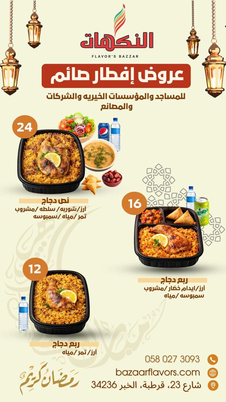 استمتع بعروض حصرية على وجبات إفطار صائم للمساجد والمؤسسات الخيرية والشركات والمصانع — وجبات أُعدّت بعناية لتجمع بين الجودة العالية والطعم المميز، وتمنحك تجربة فاخرة بسعر يناسب الجميع، لتشارك الخير بأفضل صورة وأرقى مستوى.
